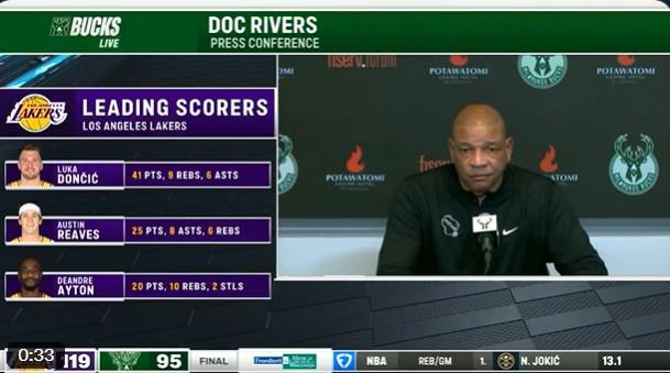 不满,雄鹿队主教练里弗斯对湖人队东契奇的争议判罚感到困惑