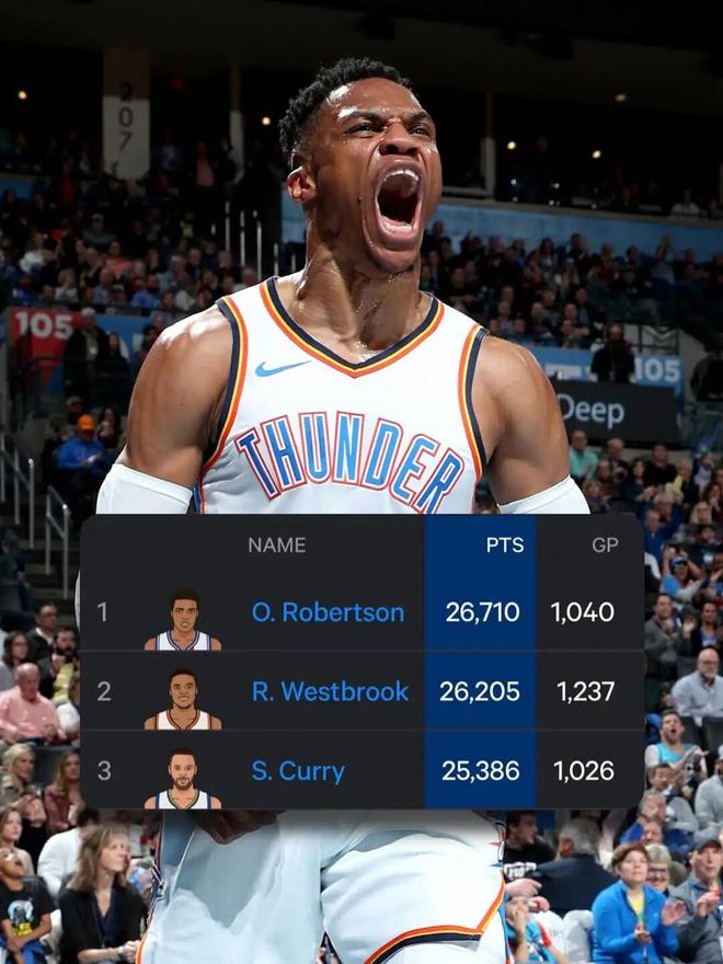 据统计,威少距离历史控卫得分王仅差505分,给人家一个赛季的时间,完全可以实现登顶。