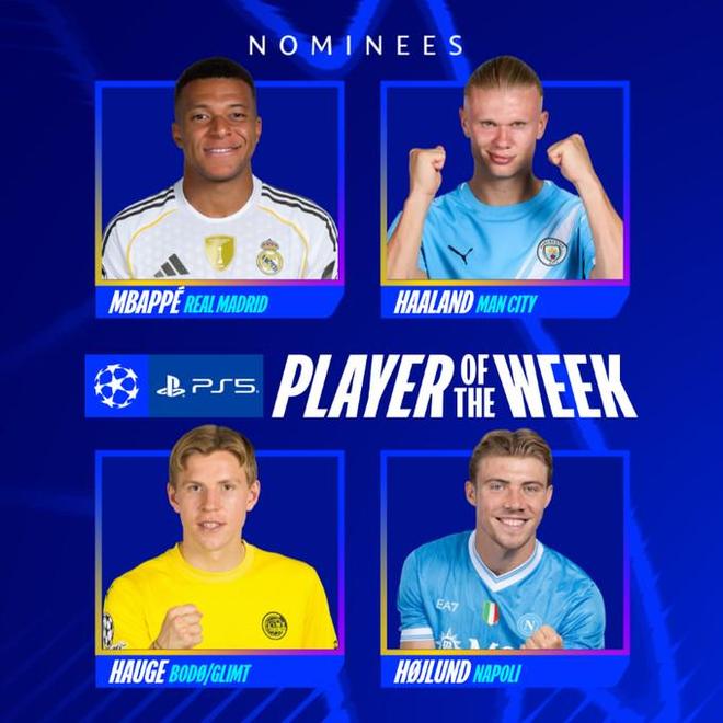 欧冠联赛阶段第二轮所有比赛战罢,欧冠官方公布了本周最佳球员候选,分别是姆巴佩、哈兰德、海于格、霍伊伦。